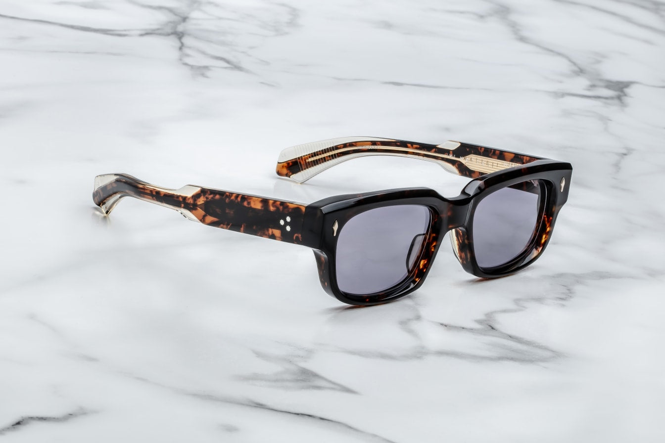 HAVANA 10MM CURED CELLULOSE ACETATE FRAME WITH CUSTOM DOUBLE LAMINATED ACETATE TEMPLES FEATURING PRECIOUS METAL HARDWARE AND BLUE LENSES