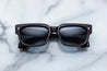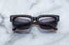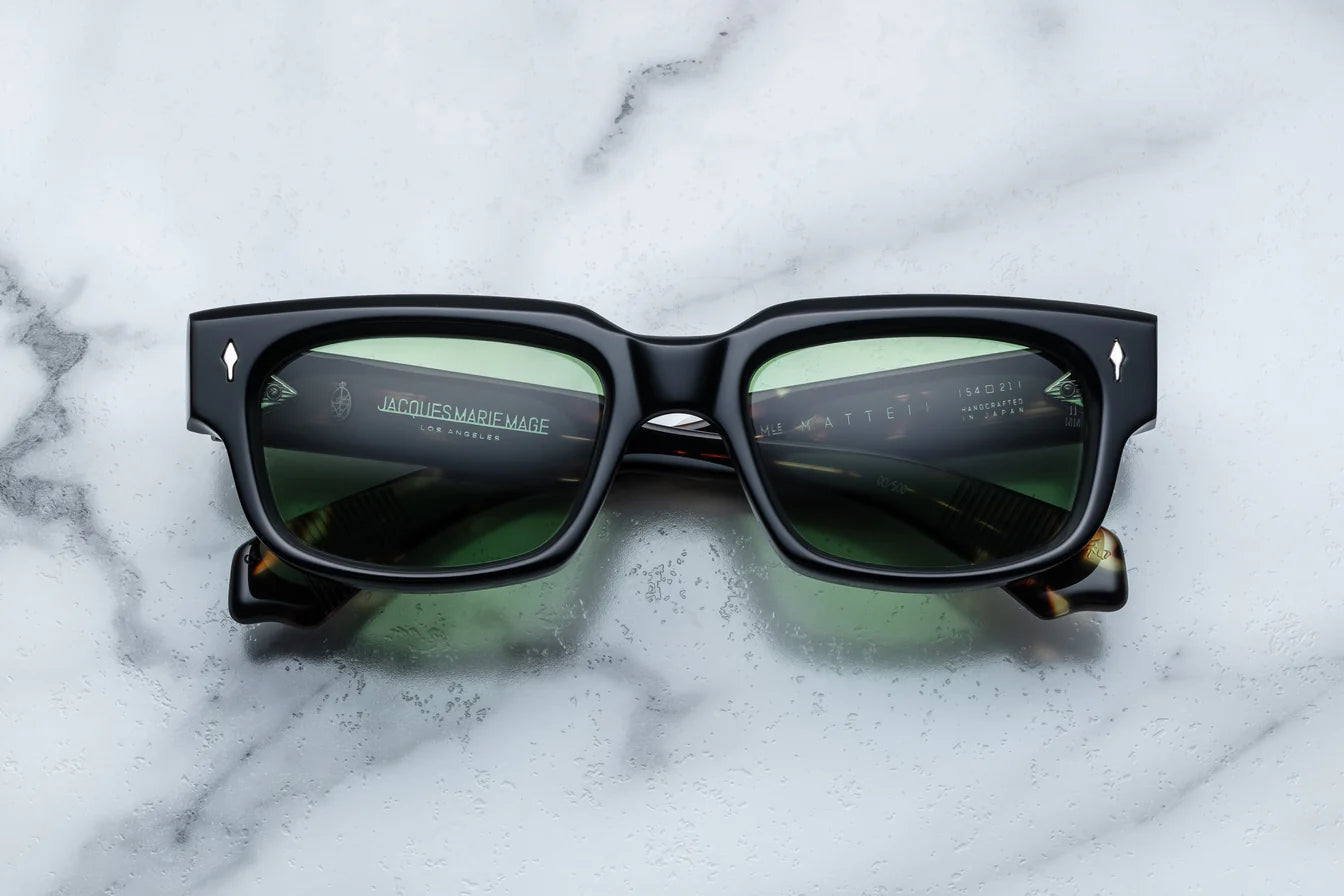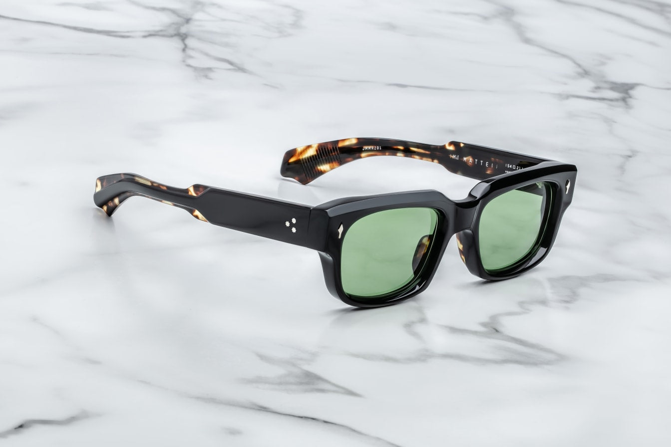 BLACK 10MM CURED CELLULOSE ACETATE FRAME WITH CUSTOM DOUBLE LAMINATED ACETATE TEMPLES FEATURING PRECIOUS METAL HARDWARE AND GREEN LENSES