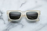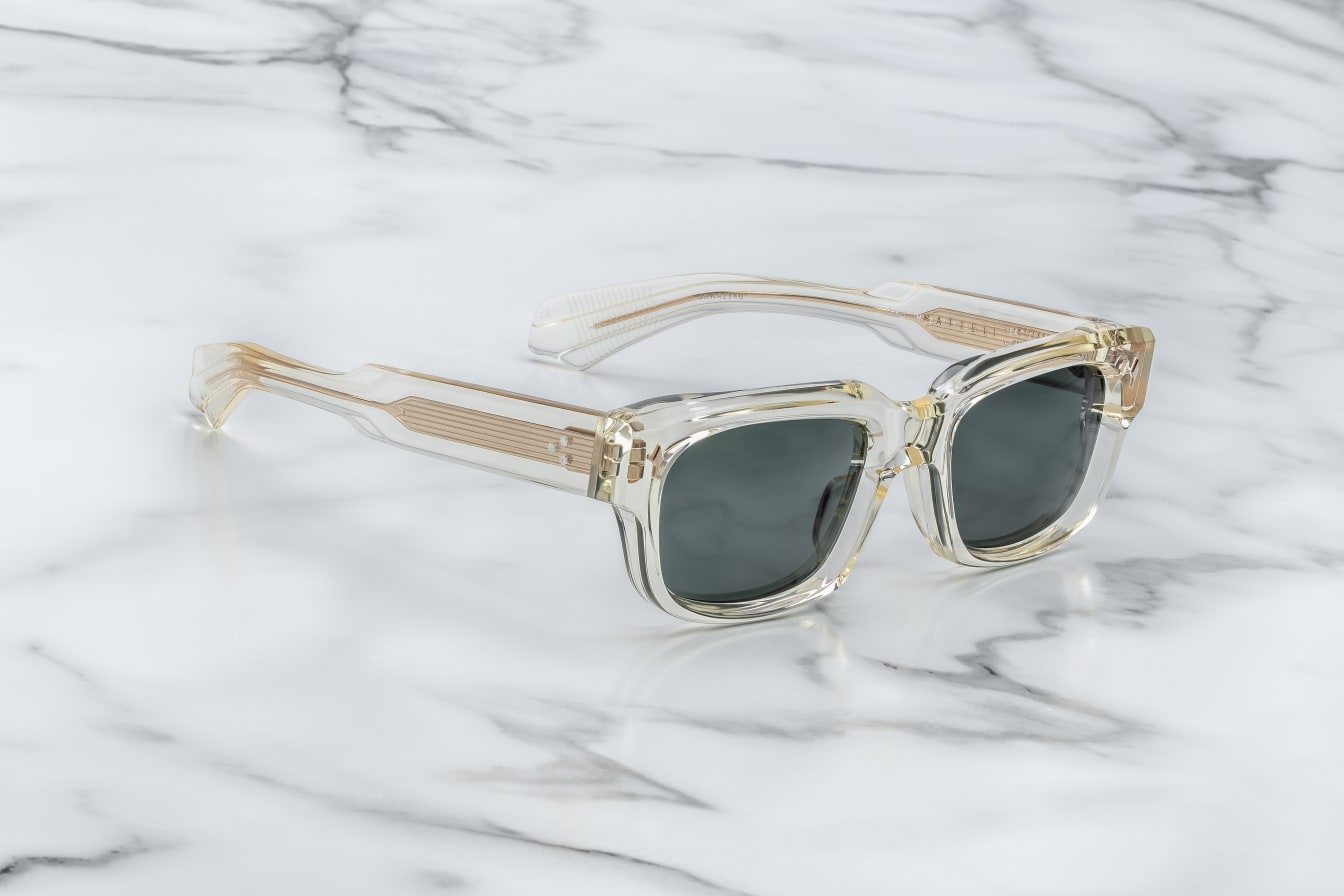 CRYSTAL 10MM CURED CELLULOSE ACETATE FRAME WITH CUSTOM DOUBLE LAMINATED ACETATE TEMPLES FEATURING PRECIOUS METAL HARDWARE AND GREEN LENSES