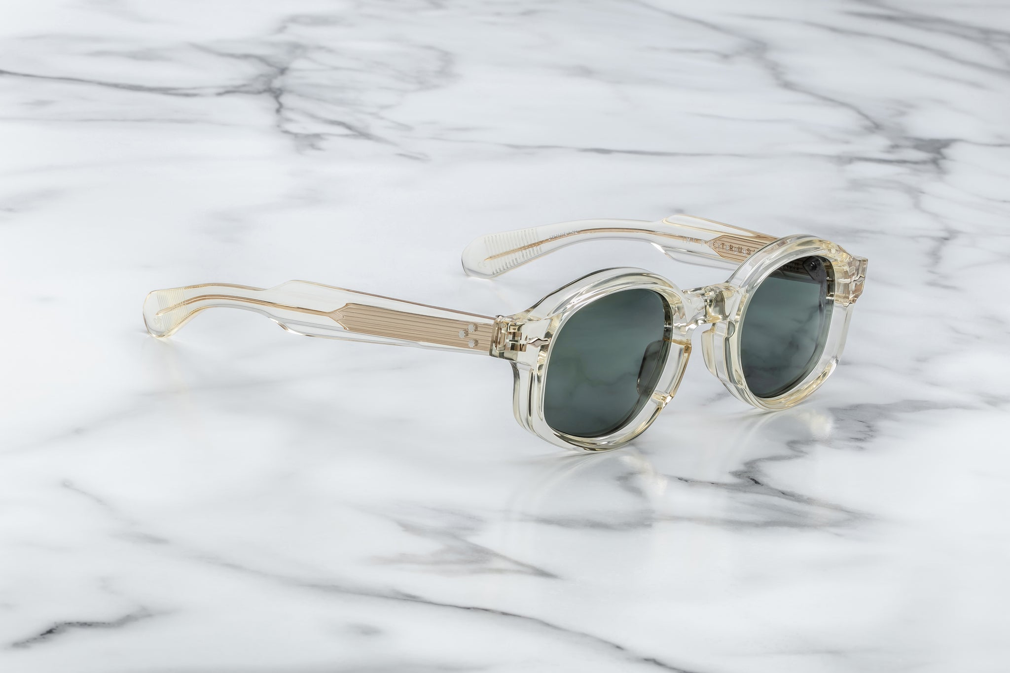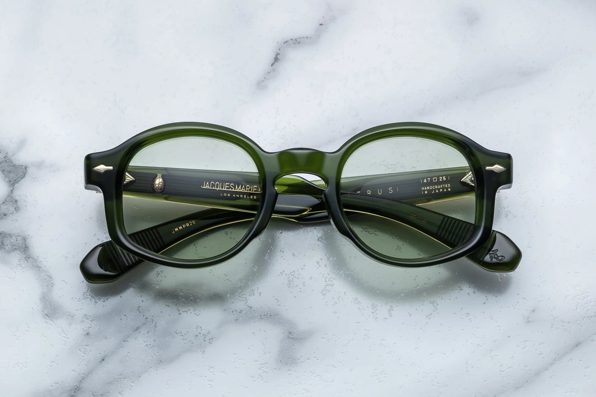 10MM CURED CELLULOSE ACETATE FRAME IN GREEN WITH CUSTOM DOUBLE LAMINATED TEMPLES COMPOSED OF GREEN EXTERIORS AND INTERIORS, COMPLEMENTED BY ARMOLITE 6 BASE LENSES IN LIGHT BOTTLE GREEN WITH BACKSIDE ANTI REFLECTIVE TREATMENT