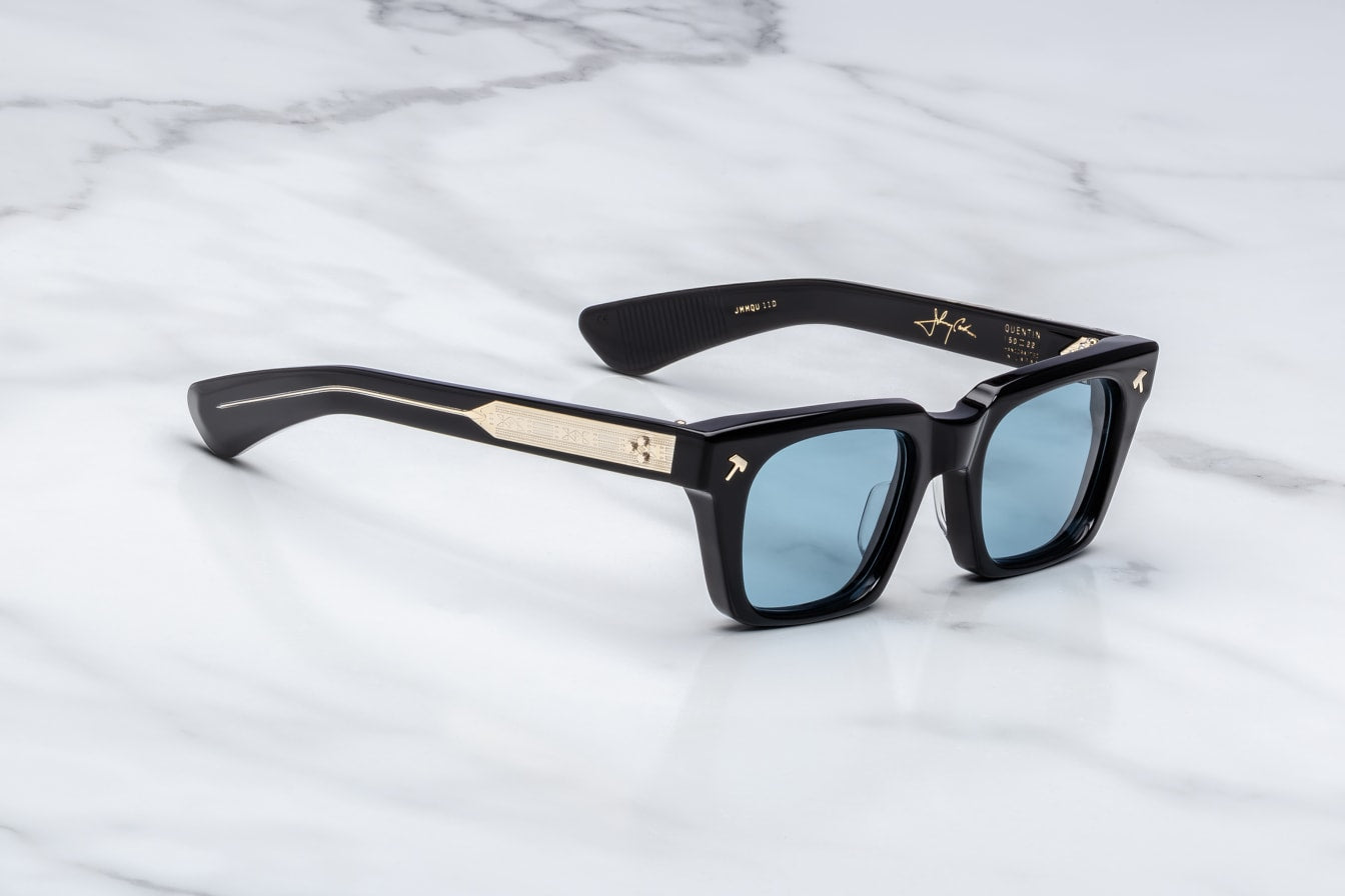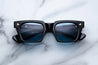 BLACK DOUBLE LAMINATED 10MM CURED CELLULOSE ACETATE FRAME WITH CUSTOM DOUBLE LAMINATED ACETATE TEMPLES AND BLUE LENSES
