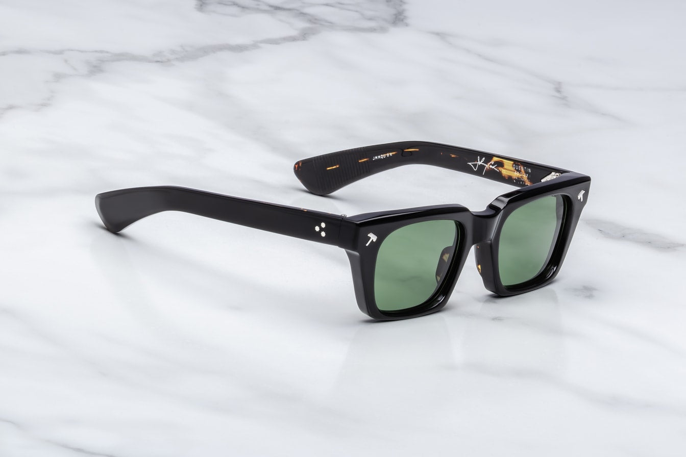 BLACK DOUBLE LAMINATED 10MM CURED CELLULOSE ACETATE FRAME WITH CUSTOM DOUBLE LAMINATED ACETATE TEMPLES AND GREEN LENSES