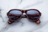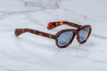 HAVANA 10MM CURED CELLULOSE ACETATE FRAME WITH CUSTOM DOUBLE LAMINATED ACETATE TEMPLES FEATURING PRECIOUS METAL HARDWARE AND BLUE LENSES