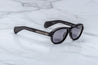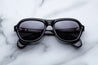 BLACK 10MM CURED CELLULOSE ACETATE FRAME WITH CUSTOM DOUBLE LAMINATED ACETATE TEMPLES FEATURING PRECIOUS METAL HARDWARE AND GREY LENSES