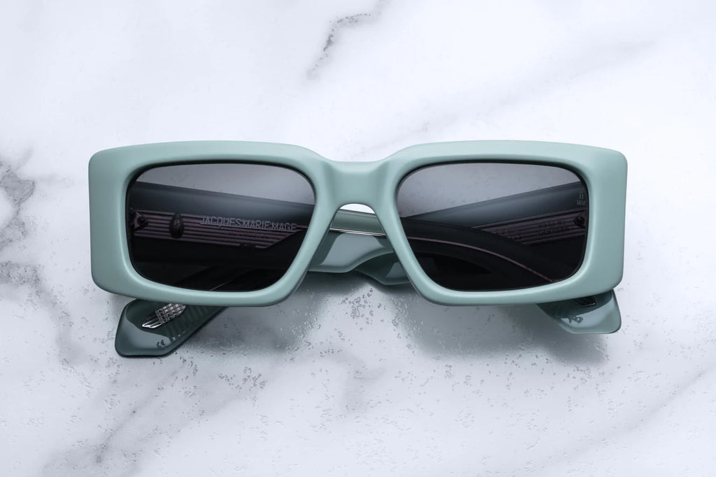 GREEN 10MM CURED CELLULOSE ACETATE FRAME WITH CUSTOM ACETATE DOUBLE LAMINATED TEMPLES AND BLACK LENSES