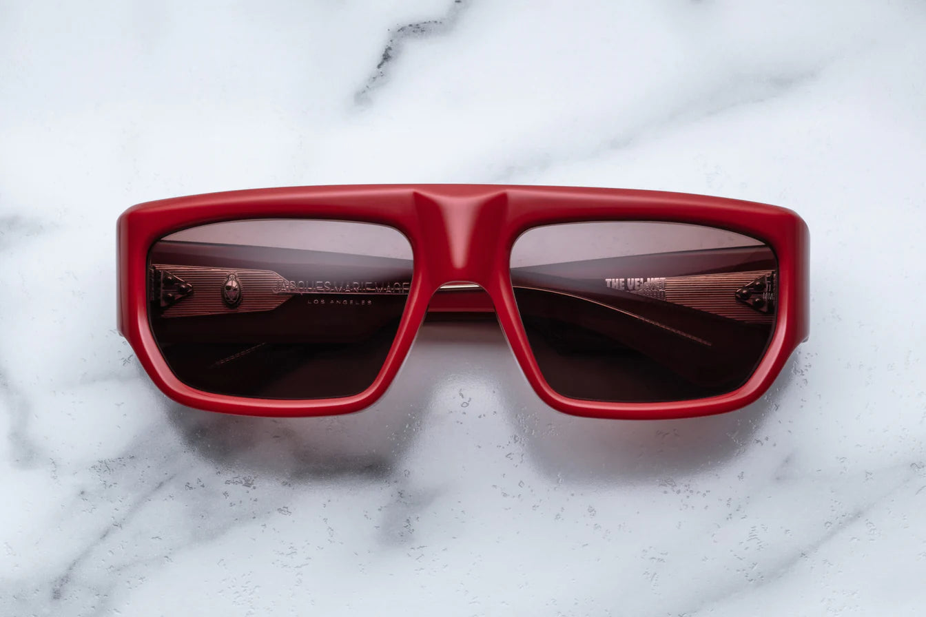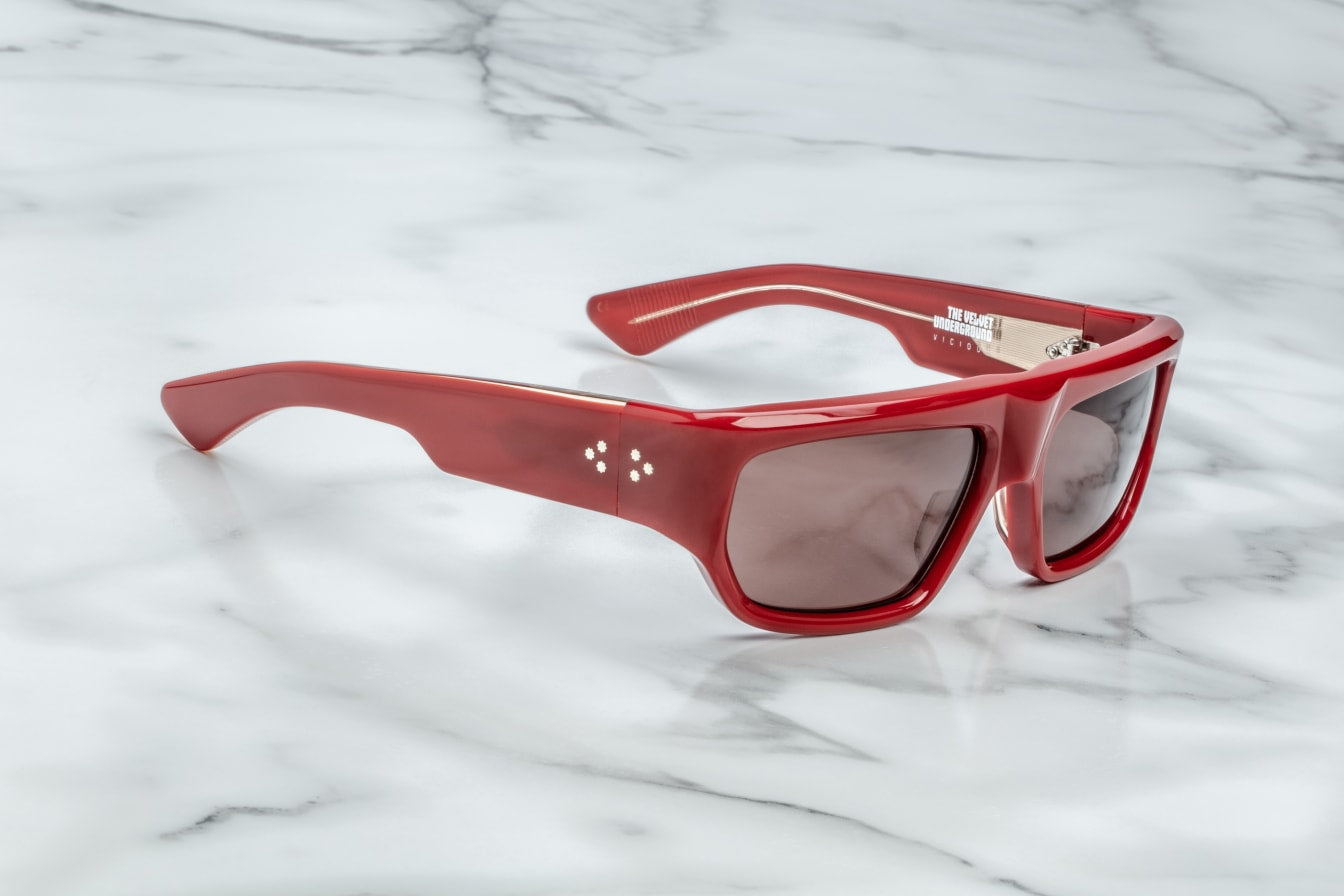 RED 7MM CURED CELLULOSE ACETATE FRAME WITH CUSTOM DOUBLE LAMINATED ACETATE TEMPLES FEATURING PRECIOUS METAL HARDWARE AND BROWN LENSES