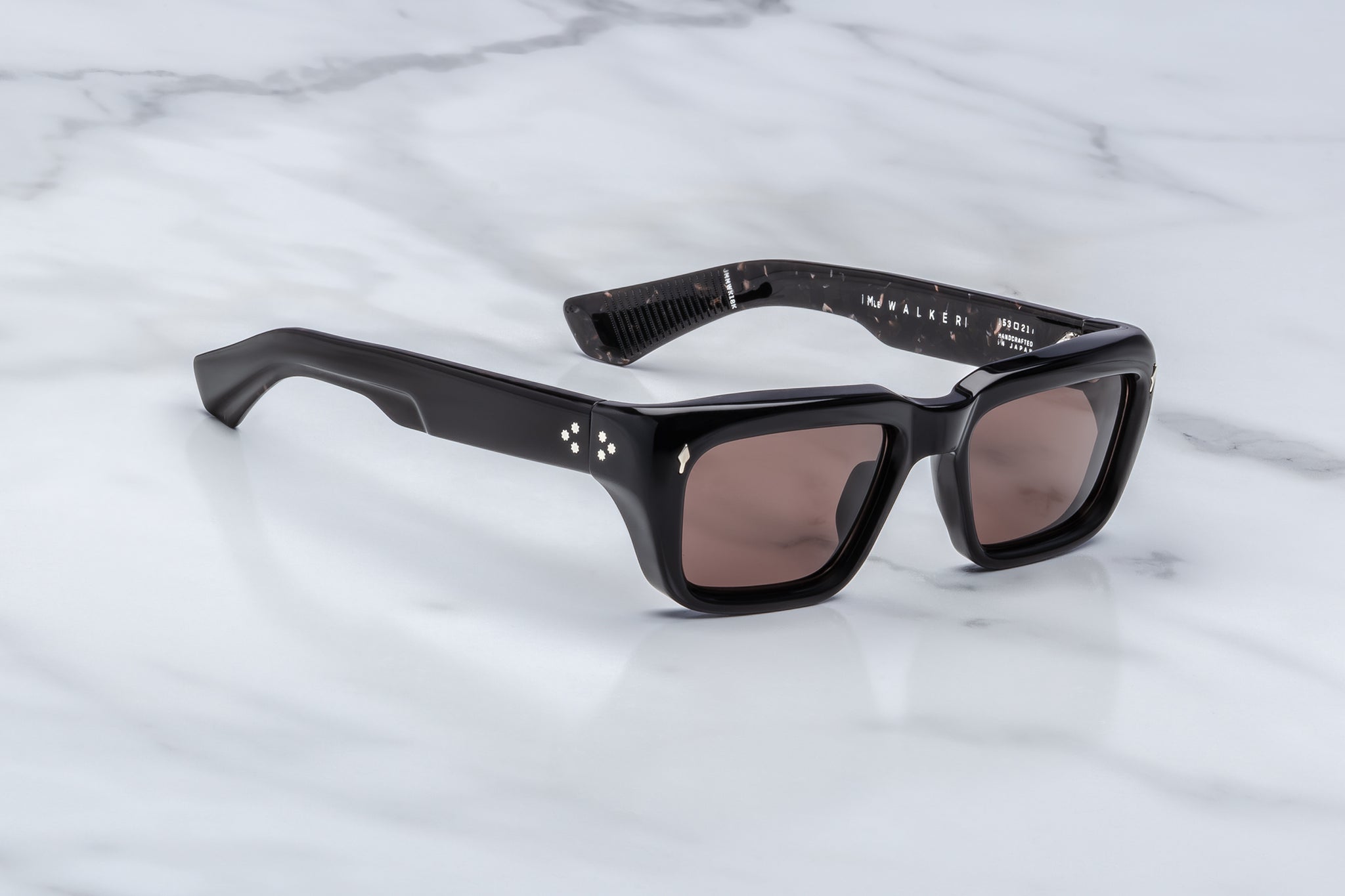 BLACK 10MM CURED CELLULOSE ACETATE FRAME WITH CUSTOM DOUBLE LAMINATED ACETATE TEMPLES AND BROWN LENSES