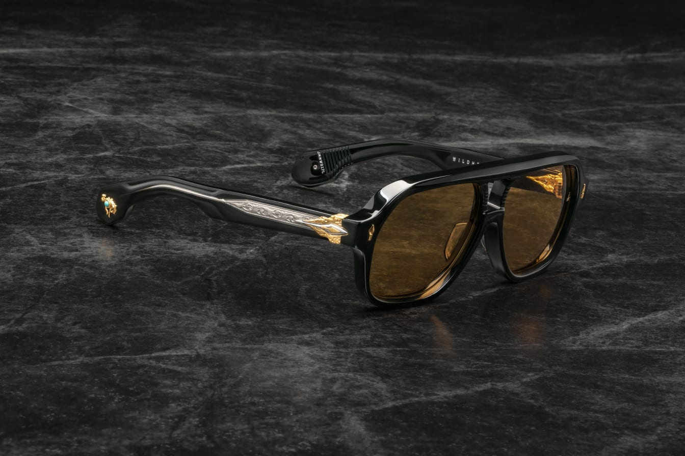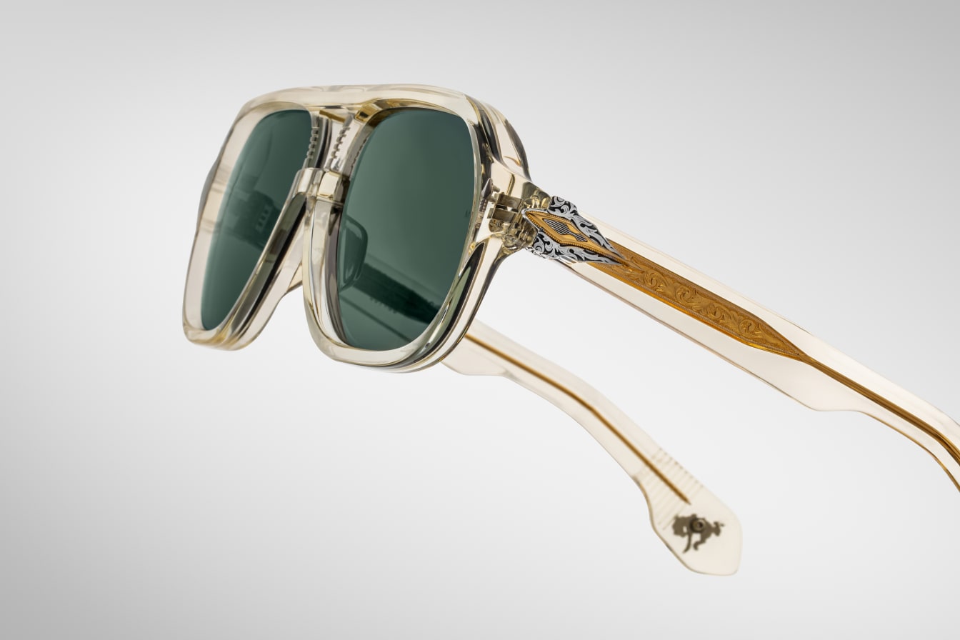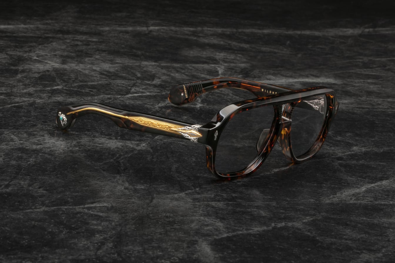 More than a simple beast of burden, these limited-edition spectacles are as crucial to practical enterprises as they are to spiritual exercises, featuring a distinct double-bridge and our signature arrowhead front pins, complemented by a sculptural arrowhead temple motif with polished metal embellishments, double-laminated temples with finely engraved ‘Damascus’ wirecores, and ‘bucking bronco’ cameos at the temple tips with real turquoise inlays.