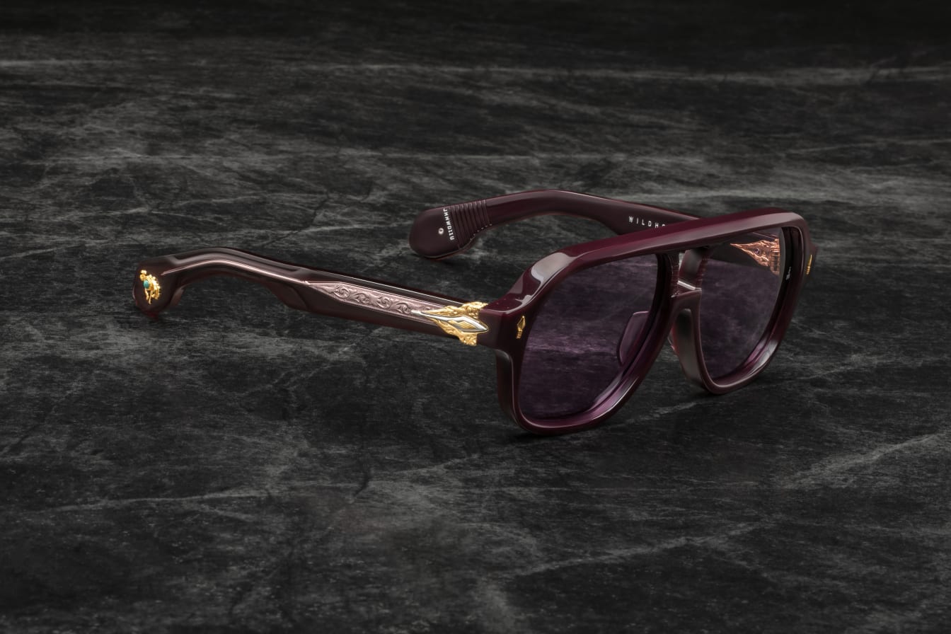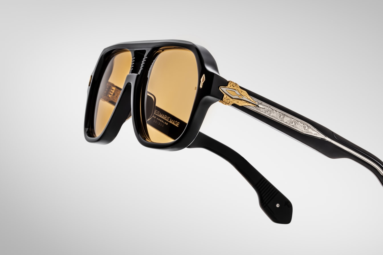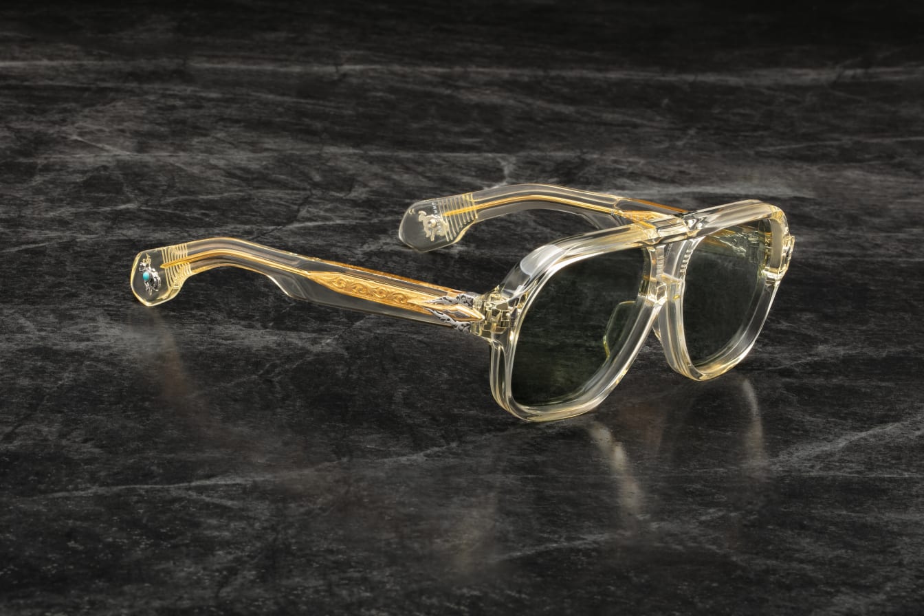 More than a simple beast of burden, these limited-edition spectacles are as crucial to practical enterprises as they are to spiritual exercises, featuring a distinct double-bridge and our signature arrowhead front pins, complemented by a sculptural arrowhead temple motif with polished metal embellishments, double-laminated temples with finely engraved ‘Damascus’ wirecores, and ‘bucking bronco’ cameos at the temple tips with real turquoise inlays.