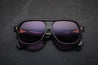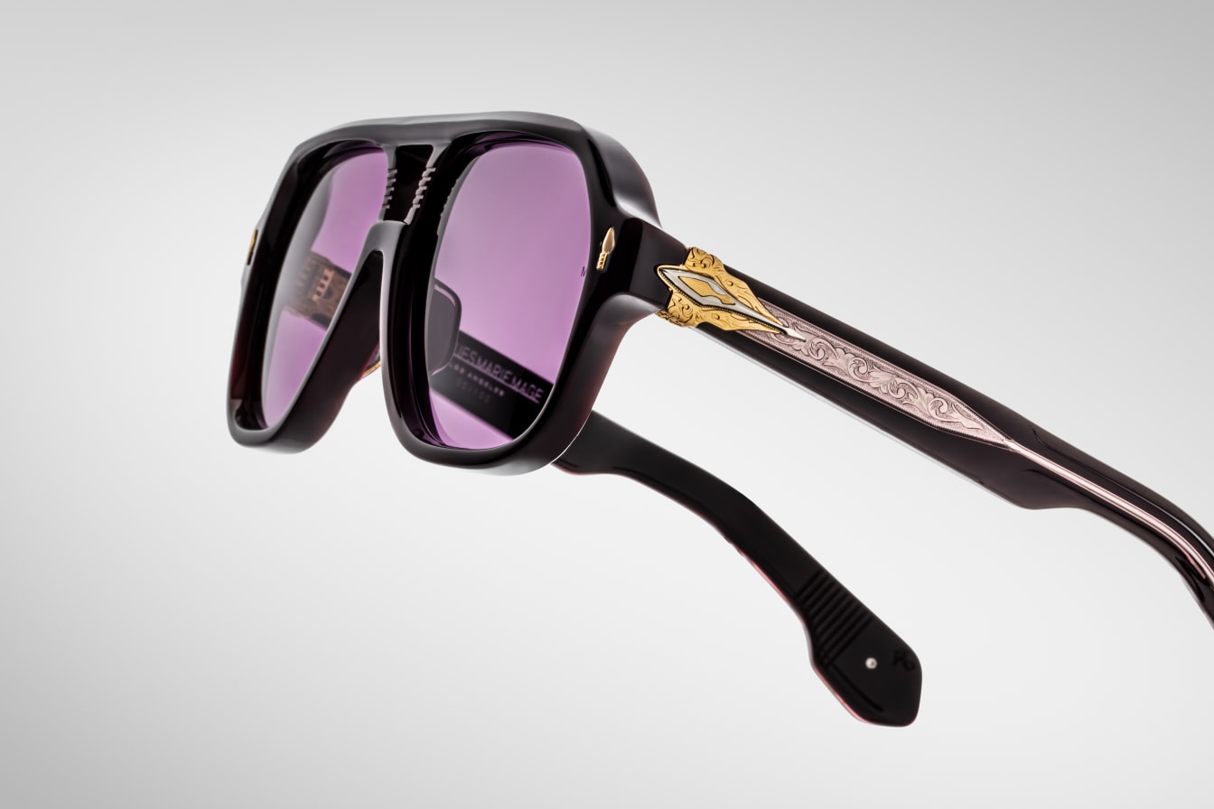 PURPLE 10MM CURED CELLULOSE ACETATE FRAME WITH CUSTOM DOUBLE LAMINATED ACETATE TEMPLES FEATURING PRECIOUS METAL HARDWARE AND PURPLE LENSES