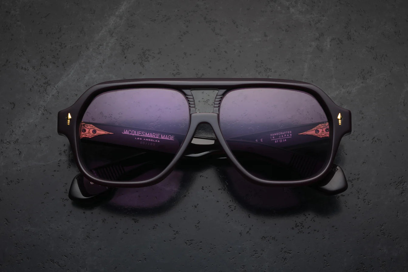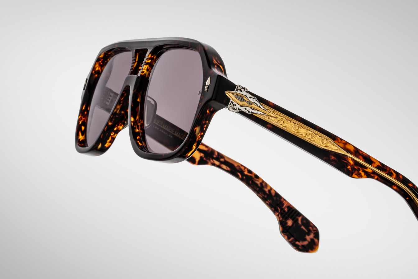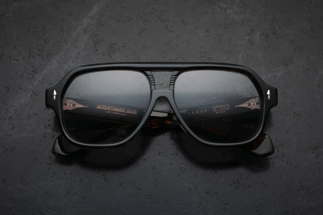 Limited-edition acetate navigators from the Last Frontier, featuring a sculptural double-bridge, signature arrowhead front pins, piercing arrowhead temple motif with polished metal embellishments, finely engraved ‘Damascus’ wirecores, and ‘bucking bronco’ medallions with real turquoise inlays at the temple tips.