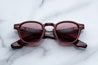 10MM CURED CELLULOSE ACETATE FRAME IN BORDEAUX EMPIRE WITH CUSTOM DOUBLE-LAMINATED TEMPLES COMPOSED OF CLEAR EXTERIORS AND BORDEAUX EMPIRE INTERIORS, COMPLEMENTED BY ARMORLITE 6-BASE LENSES IN RUBY WITH BACKSIDE ANTI-REFLECTIVE TREATMENT