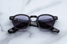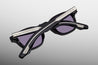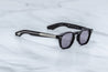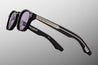 10MM CURED CELLULOSE ACETATE FRAME IN POLISHED BLACK WITH CUSTOM DOUBLE-LAMINATED TEMPLES COMPOSED OF CLEAR EXTERIORS AND POLISHED BLACK INTERIORS, COMPLEMENTED BY ARMORLITE 6-BASE LENSES IN NIMBUS WITH BACKSIDE ANTI-REFLECTIVE TREATMENT