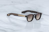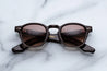 10MM CURED CELLULOSE ACETATE FRAME IN DARK BROWN WITH CUSTOM DOUBLE-LAMINATED TEMPLES COMPOSED OF CLEAR BEIGE EXTERIORS AND DARK BROWN INTERIORS, COMPLEMENTED BY ARMORLITE 6-BASE LENSES IN CHOCO GRADIENT WITH BACKSIDE ANTI-REFLECTIVE TREATMENT