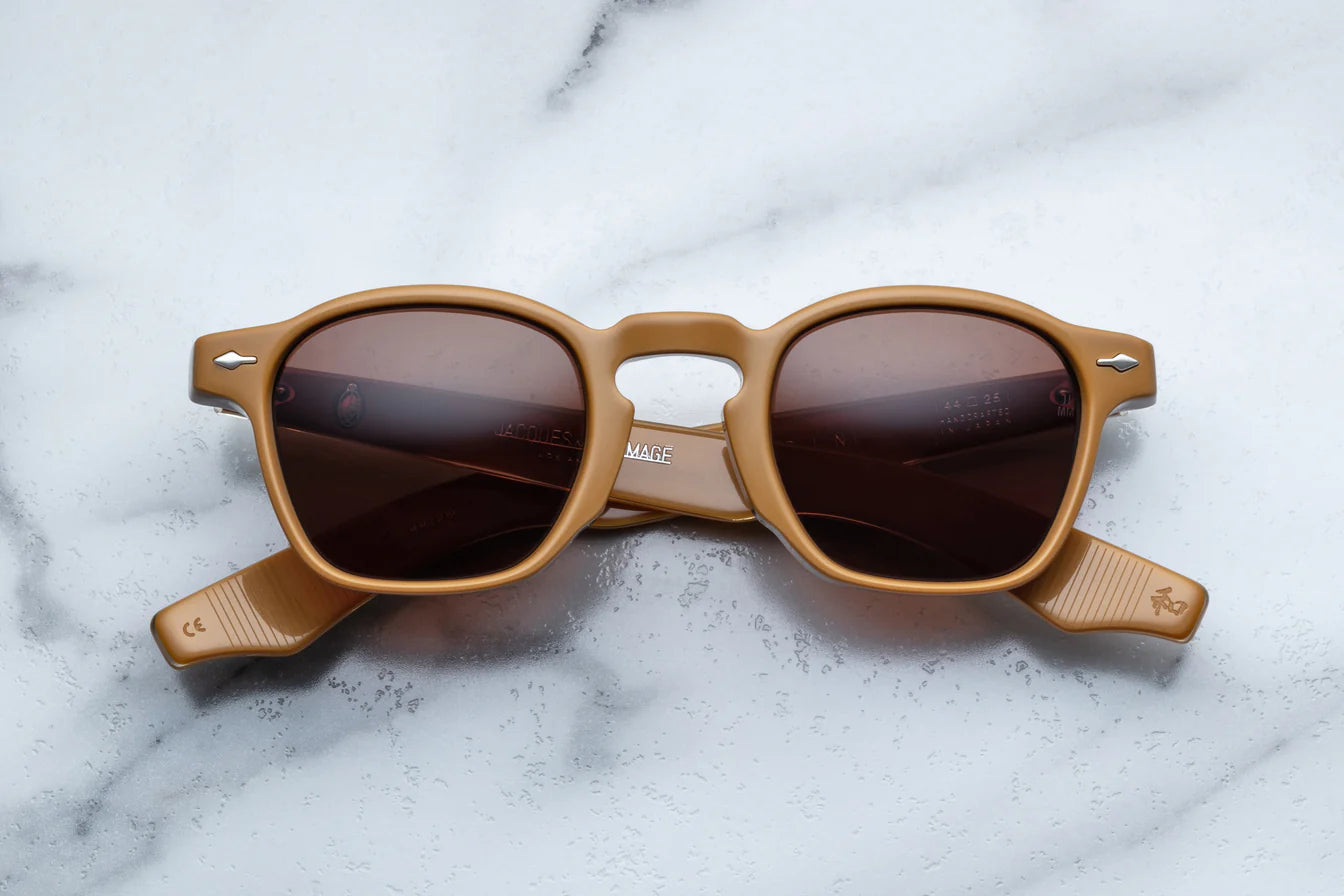 TAN 10MM CURED CELLULOSE ACETATE FRAME WITH CUSTOM ACETATE TEMPLES FEATURING PRECIOUS METAL HARDWARE AND BROWN LENSES