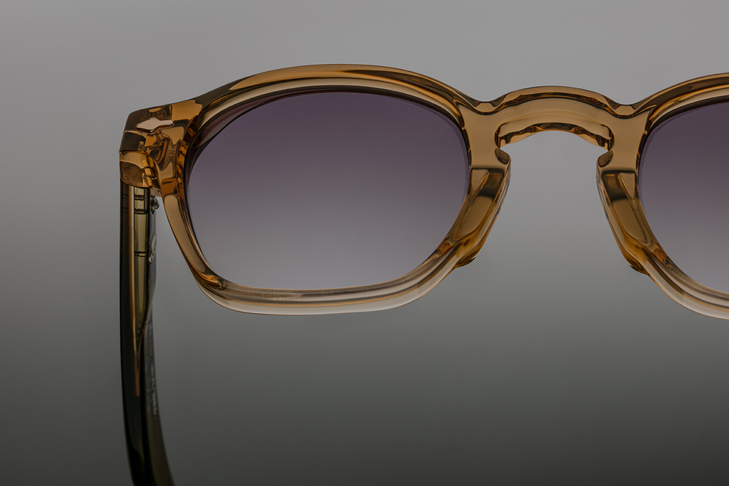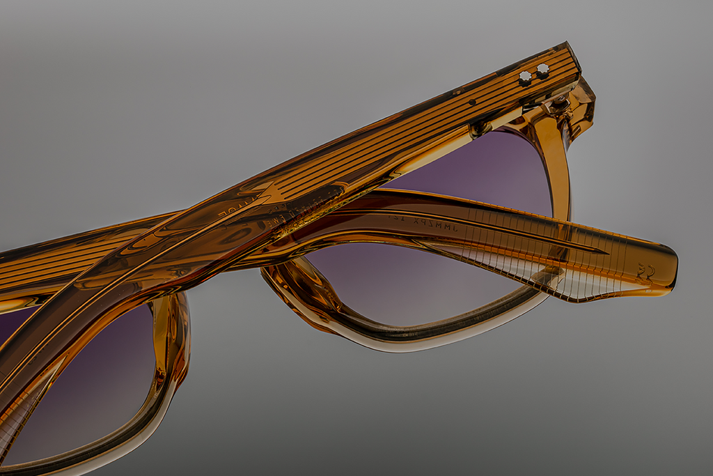 BROWN 10MM CURED CELLULOSE ACETATE FRAME WITH CUSTOM DOUBLE LAMINATED ACETATE TEMPLES AND PURPLE GRADIENT CR39 LENSES