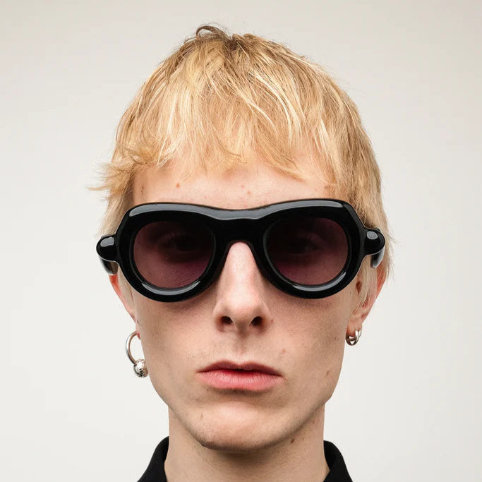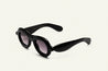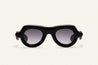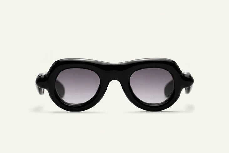 High-gloss black acetate with gradient grey lenses, round and quietly enigmatic.